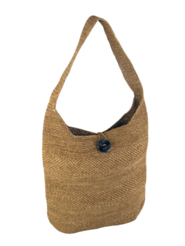 Sac en raphia crocheté (teinté avec des pigments naturels), anses en cuir (tanné selon un procédé 100% végétal), fermeture à l'aide d'un bouton.